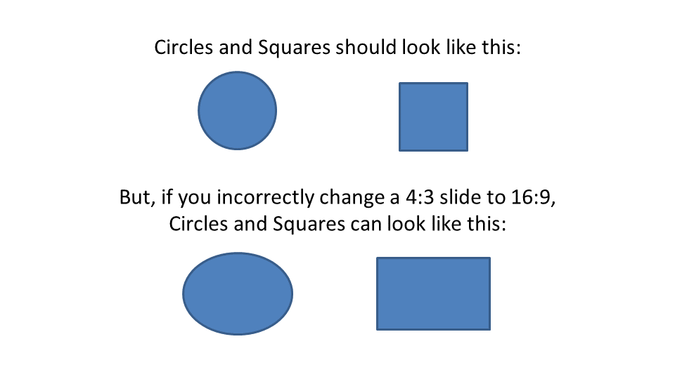 The presentation layout must be set before creating the presentation. You cannot simply take an existing 4:3 presentation and change it to 16:9. If you do, images might become stretched, (e.g., circles will become ovals, squares will become rectangles). In some instances, images are not changed at all, but everything else in the slide might change, such as size and position.